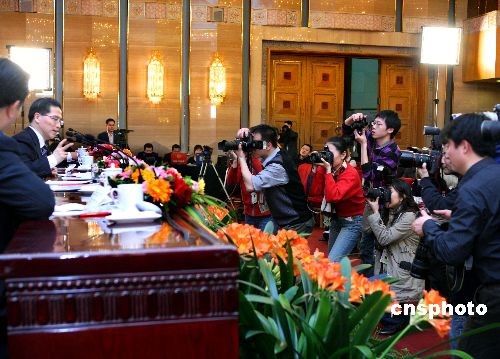 在全國(guó)政協(xié)十一屆二次會(huì)議3月8日就2010年5月上海舉辦世界博覽會(huì)舉行記者會(huì),萬季飛、周漢民、成岳沖、楊瀾等四位全國(guó)政協(xié)委員回答記者提問。他們回答了籌備中的上海世界博覽會(huì)資金來源,籌備進(jìn)度情況,外界關(guān)注的美國(guó)、臺(tái)灣參展情況,金融危機(jī)的影響及民營(yíng)企業(yè)參展情況等問題。與會(huì)中外記者表現(xiàn)出極大關(guān)注,爭(zhēng)相提問。中新社發(fā) 宋吉河 攝