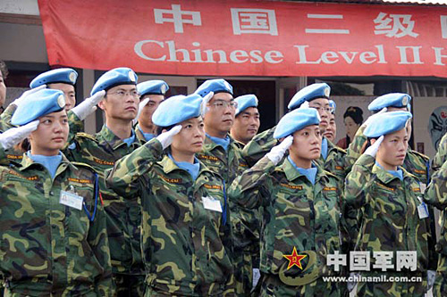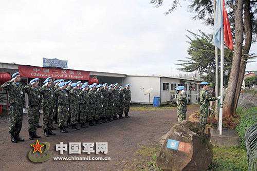 中國第九批赴剛果(金)維和醫(yī)療分隊(duì)舉行升國旗儀式,紀(jì)念三八國際婦女節(jié)。武國強(qiáng) 攝