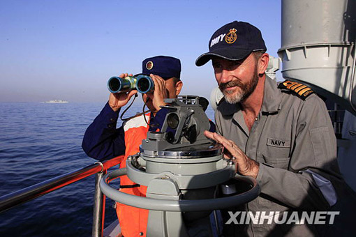 3月9日,在巴基斯坦南部卡拉奇港附近的阿拉伯海舉行的“和平-09”海上多國聯(lián)合軍事演習(xí)實兵演練中,澳大利亞海軍觀察員(右)在中國海軍“廣州”號驅(qū)逐艦上觀摩演習(xí)。查春明 攝