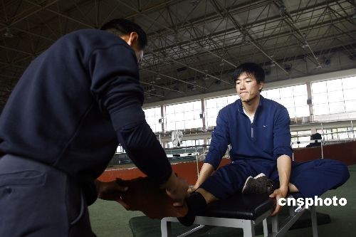 3月10日上午, 劉翔在上海莘莊基地開始進(jìn)行正式訓(xùn)練,在訓(xùn)練間隙,孫海平教練用一塊海綿來幫助訓(xùn)練劉翔右腳的靈敏性。孫海平教練表示:由于劉翔的傷勢剛剛恢復(fù),右腳踝關(guān)節(jié)力量還不夠,用海綿訓(xùn)練是為了增加劉翔右腳踝的靈活性。”中新社發(fā) 湯彥俊 攝