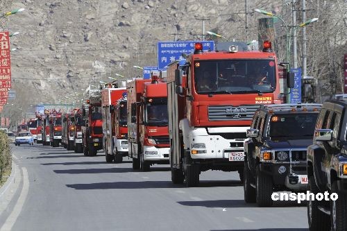 3月10日,西藏公安消防特種消防車輛行駛在拉薩街頭。當(dāng)日,西藏公安消防特種裝備車輛服役儀式在拉薩市舉行,26輛消防車輛在市區(qū)主要街道進(jìn)行拉動(dòng)演練。中新社發(fā) 廖攀 攝