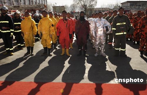 3月10日,西藏公安消防特種裝備車(chē)輛服役儀式在拉薩舉行,儀式上消防官兵列隊(duì)整齊。中新社發(fā) 廖攀 攝
