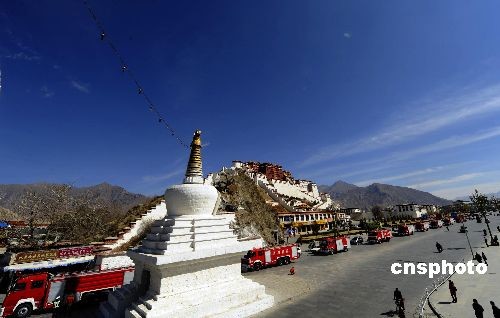 3月10日,西藏公安消防特種裝備車輛駛過布達拉宮廣場。當日,西藏公安消防特種裝備車輛服役儀式在拉薩市舉行,26輛消防車輛在市區(qū)主要街道進行拉動演練。中新社發(fā) 廖攀 攝