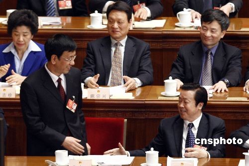 3月10日,十一屆全國人大二次會議在北京人民大會堂舉行第三次全體會議,最高人民法院院長王勝俊、最高人民檢察院檢察長曹建明分別作工作報告。圖為曹建明作完報告回到座位后與王勝俊握手。中新社發(fā) 盛佳鵬 攝