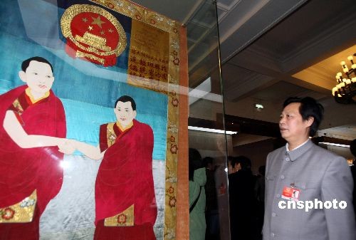全國政協(xié)文藝界委員、扮演“毛澤東”的演員汪國新,3月11日參觀在北京民族宮舉辦的西藏民主改革50年大型展覽。中新社發(fā) 傅丹丹 攝