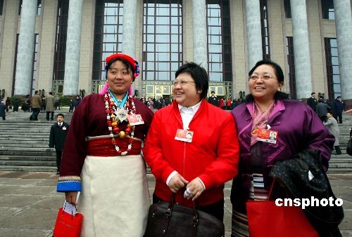 圖為歌星韓紅與藏族委員們?cè)诖髸?huì)堂前留影。中新社發(fā) 傅丹丹 攝