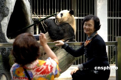 三月十二日,臺灣游客在福州熊貓世界與熊貓近距離合影留念。大熊貓“團團”、“圓圓”在臺灣產(chǎn)生的效應,致使現(xiàn)在來福州觀看熊貓的臺灣游客比以前增加三倍以上。中新社發(fā) 王東明 攝