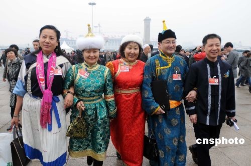 2009年3月12日上午,中國(guó)人民政治協(xié)商會(huì)議第十一屆全國(guó)委員會(huì)第二次會(huì)議圓滿完成各項(xiàng)議程后在人民大會(huì)堂閉幕。圖為在人民大會(huì)堂前的少數(shù)民族代表。中新社發(fā) 宋健浩 攝
