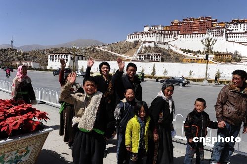 3月13日,西藏拉薩布達拉宮廣場,來自青海的藏族一家人來到拉薩朝佛。中新社發(fā) 廖攀 攝