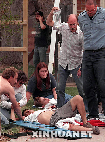 1999年4月,美國(guó)科羅拉多州利特爾頓市哥倫拜恩中學(xué)18歲的學(xué)生埃里克·哈里斯和17歲的迪倫·克萊博爾德槍殺了1名教師和12名同學(xué),然后飲彈自盡。這是1999年4月20日,救護(hù)人員在哥倫比恩中學(xué)搶救槍擊案中的受傷者。