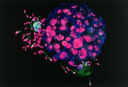 人類胚胎和精子:這張色彩艷麗的美麗圖片,是利用共聚焦顯微鏡拍攝的。胚胎和精細(xì)胞核呈紫色,而精子的尾巴是綠色。藍色區(qū)域是縫隙連接(gap junction),它們把細(xì)胞彼此聯(lián)系在一起。
