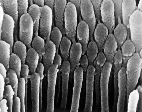 耳毛細(xì)胞:這張圖片看起來(lái)好像是在耳朵里面對(duì)耳毛細(xì)胞進(jìn)行近距離觀察時(shí)拍攝的。耳毛細(xì)胞的主要功能是發(fā)現(xiàn)對(duì)聲震作出反應(yīng)時(shí)產(chǎn)生的機(jī)械運(yùn)動(dòng)。
