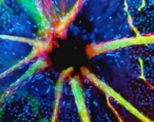 從視神經(jīng)中伸出的血管:這張照片顯示的是血管從黑色視盤中伸出。視盤是個(gè)盲點(diǎn),因?yàn)橐暰W(wǎng)膜的這個(gè)區(qū)域沒有光感細(xì)胞,視神經(jīng)和視網(wǎng)膜血管從眼睛后面的這個(gè)部位伸出去。