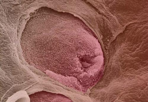 舌頭上的味蕾:這張彩色圖片上顯示的是舌頭上的一個(gè)味蕾。人舌上大約擁有10000個(gè)味蕾,味蕾所感受的味覺可分為甜、酸、苦、咸四種。
