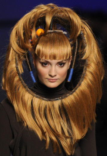 3月16日,模特在烏克蘭基輔舉行的時(shí)尚周上展示造型奇麗的發(fā)型設(shè)計(jì)。