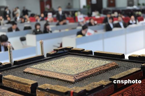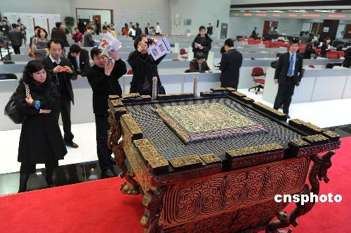 3月18日,2008北京第29屆奧運(yùn)會(huì)開幕式演出道具“缶”最后一場專場拍賣在北京產(chǎn)權(quán)交易所完美落槌。22個(gè)標(biāo)的共320個(gè)缶以總價(jià)4138萬元拍出。此外10個(gè)標(biāo)的共200幅竹簡以總價(jià)637.5萬元成交。共有132家單位和個(gè)人參與了此次競買,單個(gè)“奧運(yùn)缶”的成交均價(jià)12.93萬元,超過第一批“奧運(yùn)缶”成交均價(jià)一倍有余,單個(gè)“竹簡”成交均價(jià)3.18萬元。中新社發(fā) 遠(yuǎn)舟 攝
