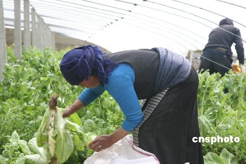 近年來,用溫室大棚種植蔬菜在西藏日益推廣。在強烈的日光照射下,大棚內(nèi)溫暖如春。就是在青黃不接的冬春時節(jié),大棚內(nèi)都可生長各種新鮮蔬菜供應(yīng)市場。圖為3月17日拉薩近郊曲水縣的一對藏族夫婦在收獲大白菜。中新社發(fā) 王林 攝