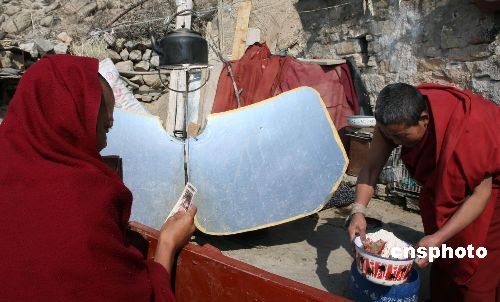 3月18日,拉薩哲蚌寺的僧尼在用太陽灶燒水。西藏首府拉薩市地處海拔3650米的河谷沖擊平原,是世界上海拔最高的城市之一。這里年日照時數3000小時以上,故有"日光城"之美稱。為節(jié)約能源,拉薩市正在大范圍推廣太陽灶。據稱,在拉薩市,一臺太陽能灶每年可節(jié)約燒柴12立方米。中新社發(fā) 王林 攝