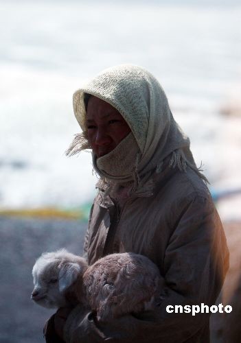一名抱著小羊羔的藏族女孩等待與游人合影。中新社發(fā) 杜洋 攝