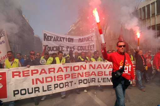 3月19日法國各大工會在全國各地聯(lián)合組織罷工和示威游行等活動,抗議薩科齊政府在應對當前經(jīng)濟危機過程中忽視勞動者權(quán)益和社會福利。圖為法國城市馬賽舉行罷工游行。