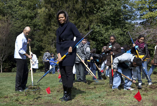 中新網(wǎng)3月21日電 當(dāng)?shù)貢r(shí)間3月20日,美國“第一夫人”米歇爾·奧巴馬帶領(lǐng)一群小學(xué)生在白宮的南草坪進(jìn)行將草地改造菜園計(jì)劃。這里種植出的食物將供“第一廚房”和華盛頓其他廚房使用。