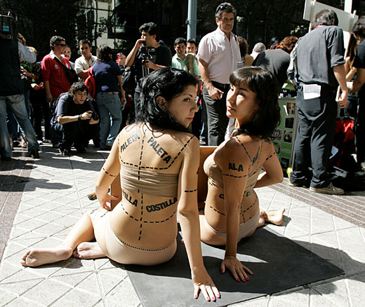 當(dāng)?shù)貢r(shí)間3月19日,來自AnimaNaturalis動(dòng)物保護(hù)組織的智利美女在首都圣地亞哥舉辦了一場別出心裁的“裸身切割”活動(dòng),呼吁民眾保護(hù)動(dòng)物。