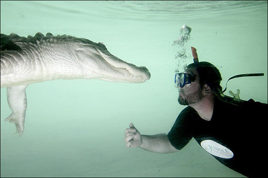 男子與鱷魚共舞。2009年1月17日,在美國佛州叢林島動(dòng)物主題公園,男子Sean Manning與一條9英尺長的美洲鱷在水下上演“人鱷共舞”場(chǎng)面。Sean Manning沒有采取任何保護(hù)措施,在水下依靠通氣管進(jìn)行呼吸,表演各種高難度動(dòng)作,為觀眾上演水下人鱷大戰(zhàn)驚險(xiǎn)場(chǎng)面。
