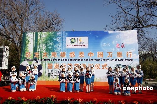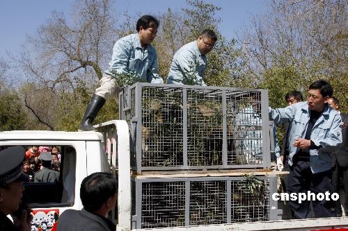 3月22日,在北京生活了9個(gè)月的8只奧運(yùn)大熊貓開始起程返回四川老家,北京動(dòng)物園特地舉辦了“奧運(yùn)熊貓返川儀式”,吸引萬名觀眾前來依依惜別。同時(shí),也為“臥龍大熊貓感恩中國萬里行活動(dòng)”劃上一個(gè)圓滿的句號。中新社發(fā) 鄭雄增 攝