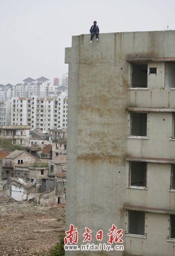 3月31日,一名來自山西太原的男子先后兩次爬上廣東佛山市禪城人民路旁的一棟9層待遷居民樓樓頂,重復(fù)著驚險(xiǎn)的“跳樓”情景。當(dāng)日下午2時(shí)30左右,該男子坐在該棟樓樓頂邊沿,拒絕警察提供的幫助,結(jié)果不小心滑落,身體懸空,幸好隨手抓了樓頂邊緣,被警察及時(shí)救起。不過讓人意外的是,當(dāng)日18:30,該男子又坐在同一棟樓樓頂邊緣,最終在警察及消防人員的勸說下離開。據(jù)公安局相關(guān)人士介紹,該男子姓劉,年紀(jì)不到20歲,自稱因工作壓力、家庭矛盾而“想不開”。目前,該男子已被警察帶至人民路附近派出所“做思想工作”,避免類似事情再次發(fā)生。張由瓊 攝