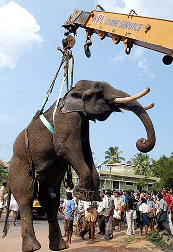 4月1日,印度喀拉拉邦一頭公象在交通繁忙的公路上被一輛卡車撞到,兩條后腿骨折和背部受傷,獸醫(yī)不得不動用起重機來搬運這個“龐然大物”。據(jù)報道,這頭大象高9英尺(約2.7米),重達6噸,剛剛從附近的一家印度教寺廟逃出。在事發(fā)現(xiàn)場,數(shù)百名觀眾正在觀看獸醫(yī)如何救治受傷的大象和如何將它搬離現(xiàn)場。一名獸醫(yī)表示,這頭大象體型龐大,情緒極不穩(wěn)定。不過,它此前一直生活在附近人來人往的寺廟,所以對人并不十分恐懼。在對大象做過全面評估后,他們決定從附近的建筑工地上征用一輛起重機,將這頭大象吊到卡車上,將它運往一家獸醫(yī)醫(yī)院。據(jù)悉,搬運工作進展得十分順利。不過,令人可悲的是,盡管獸醫(yī)在努力救治這頭大象,但由于它的傷勢過于嚴(yán)重,于當(dāng)天晚間死去。
