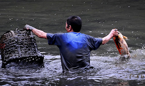 據(jù)華農(nóng)某施工隊的鄭師傅說,學(xué)校為了迎接校慶,計劃縮小池塘面積,并重新規(guī)劃周邊區(qū)域。約一周前就開始不分晝夜抽水,至昨日滿塘水被抽到塘底。昨日中午就開始有人下水捉魚,大頭魚、鯉魚、鯰魚……品種很多,每條最少五六斤,幾個小時內(nèi)已撈起近千斤魚。昨日下午3時許,曾有校衛(wèi)過來驅(qū)趕捕魚者。但校衛(wèi)一走,眾人又一窩蜂下水,之后再無人來干涉。