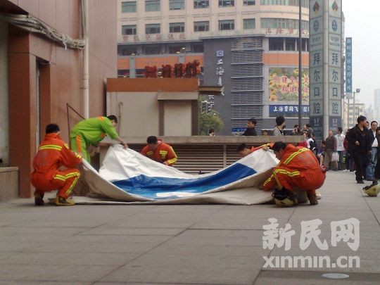 記者16時45分許趕到龍之夢時看到,一名頭發(fā)散亂的男子雙腳懸空坐在大廈9樓平臺一側,警方已在地面圍起了警戒線,消防人員也架起了救生氣墊。由于事發(fā)現(xiàn)場位處交通繁忙的長寧路凱旋路口,四周又匯集了軌道2、3、4號線車站,引起了上百名路人駐足圍觀。