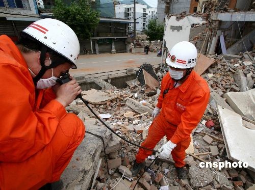 資料圖片:2008年5月15日,福州消防支隊赴川抗震救災官兵在青川縣賓和路一家主建筑已全部坍塌的大型汽車維修廠,用生命探測儀成功解救出一名被困女工。當時,在接群眾求助后,救援隊立即趕赴現場,搜索分隊首先用生命探測儀確定了女工被困的大概方位,救援分隊迅速啟動救生氣墊,并用鐵鍬和雙手以土工的方式為被困女工打開了一條生命通道,半個小時后,被困女工被成功救出。中新社發(fā) 朱曉航 攝