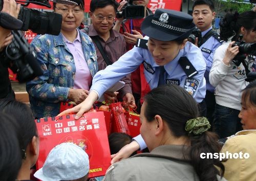 5月6日,臨近“5.12”一周年和母親節(jié)的日子,抗震英模蔣敏來到位于彭州市龍門山鎮(zhèn)東林寺板房區(qū),為那里的受災(zāi)民眾捐出自己用一個(gè)月的工資購(gòu)買的彩虹電滅蚊器。彭州市龍門山鎮(zhèn)地處龍門山脈,北與汶川縣和德陽什邡接壤,該鎮(zhèn)的東林寺板房區(qū)現(xiàn)安置了九峰村461戶群眾,1600余人。去年“5.12”地震中,九峰村村民90%的住房垮塌或成為危房。中新社發(fā) 霍潺 攝