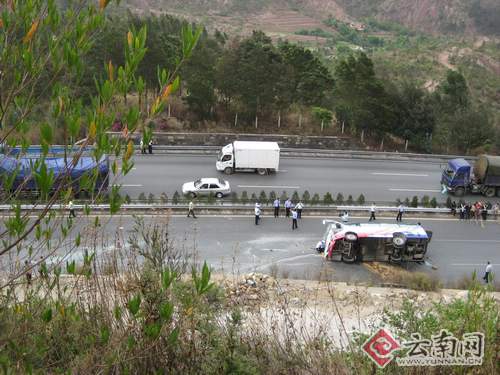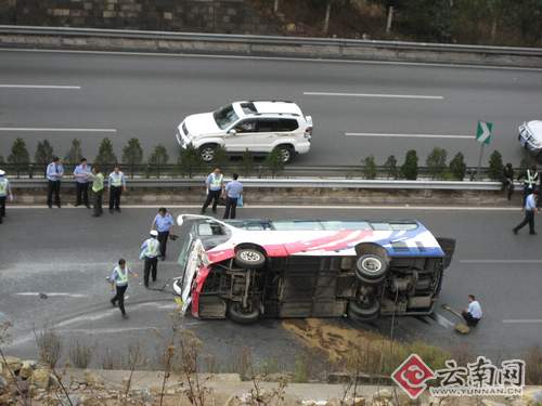 據(jù)了解,側(cè)翻的云L18477中型客車是大理交通運輸集團公司的,該車核載30人,事發(fā)時載客29人,是從下關(guān)駛往昆明的。事故原因正在進一步的調(diào)查當中。下午5時,封閉了4個多小時的安楚高速公路開始通車。