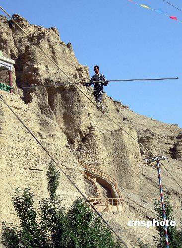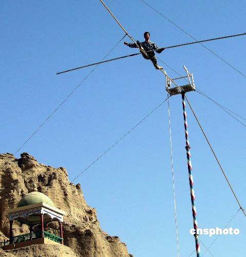 6月2日,新疆吐魯番著名的國(guó)家5A級(jí)風(fēng)景區(qū)葡萄溝上演了一場(chǎng)“達(dá)瓦孜”表演。演員在距離地面30多米的高空一根3厘米左右的鋼絲上時(shí)而健步如飛,時(shí)而倒掛,時(shí)而做各種高難度體操動(dòng)作,令觀看的游客無(wú)不稱奇。達(dá)瓦孜是維吾爾族傳統(tǒng)民間雜技表演藝術(shù)之一,“達(dá)瓦孜”是新疆維吾爾語(yǔ)“高空走繩”的意思。中新社發(fā) 姜浩 攝