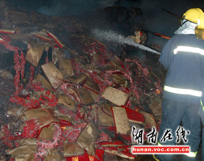 起火車輛是一輛半掛貨車,車上裝載物品正在燃燒并已經(jīng)發(fā)生爆炸,濃煙沖天,燃燒物四散飛濺。在場民警立刻設(shè)置警戒線,疏散圍觀群眾。距離現(xiàn)場一公里左右就可以看到事故地點濃煙滾滾,火光沖天,周圍500米內(nèi)到處是燃燒爆炸后的鞭炮殼。路上汽車已經(jīng)排成長龍,雙向車道全部封閉確保過往車輛及司乘人員的安全。株洲消防、路政部門積極救援,現(xiàn)場消防部門四輛消防車同時作業(yè),前2輛消防車停在距起火車輛近20米處實施滅火,第三輛車鋪設(shè)二條水帶干線出二支水槍滅火,第四輛車負(fù)責(zé)供水,阻止鞭炮繼續(xù)燃燒爆炸。