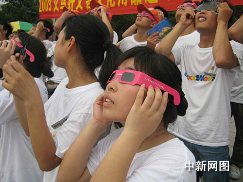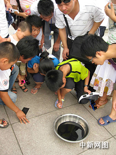 記者在觀測現(xiàn)場看到,一些天文愛好者早已架起了專業(yè)的望遠(yuǎn)鏡;而許多市民則走起“平民路線”,戴起墨色眼鏡或黑色遮光玻璃片擋住太陽光,以便更清晰地看清日食;更有“經(jīng)驗(yàn)老道”的市民,在臉盆里倒上墨汁,觀看太陽的倒影,平添了幾分傳統(tǒng)神秘色彩,引來了無數(shù)的圍觀者。