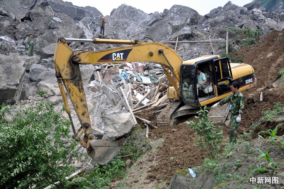 因垮塌的民房為兩層樓混泥土結構,且上有土石堆積,只攜帶了簡易救援工具的救援官兵難以快速搜救被埋者。6月7日15時許,第一臺型號為CAT320C的中型挖掘機駛進垮塌現(xiàn)場進行挖掘作業(yè)。 曹多然 攝