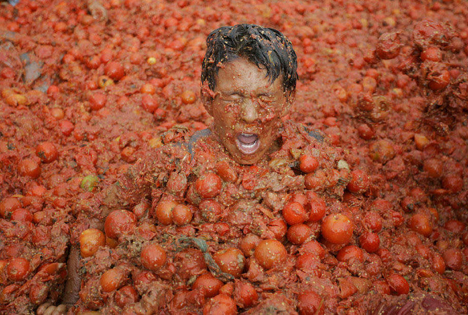 2009年6月14日,哥倫比亞第五屆番茄狂歡節(jié)開幕,參與者互相投擲西紅柿,盡情狂歡慶豐收。來自哥倫比亞各地的狂歡者們云集在首都波哥大東北部的蘇塔馬錢小鎮(zhèn),街道上立刻變成了西紅柿紛飛的戰(zhàn)場。雖然每個人的臉上身上沾滿了西紅柿汁,但人們還是樂此不疲又是丟又是砸,把成堆的西紅柿當成打仗的“武器”。還有人特地穿上白衣白褲,身上越紅,心里就越痛快。