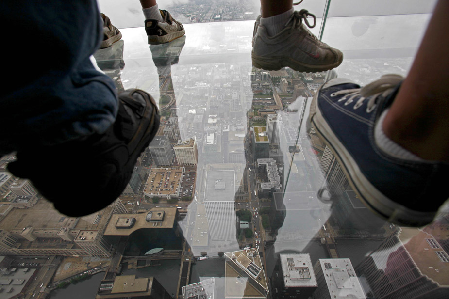 7月1日,美國芝加哥,西爾斯大廈在第103層瞭望臺增設的玻璃陽臺對媒體開放。這些玻璃陽臺建在大廈西側,從瞭望臺向外延伸約1.2米。陽臺的玻璃地板厚達12.7厘米,可承重約5噸。