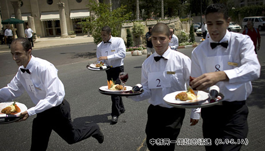 8月11日,大約30名以色列服務(wù)生端著盛有雞肉、紅酒的托盤參加在耶路撒冷舉行的服務(wù)生賽跑。點擊觀看詳細(xì)內(nèi)容