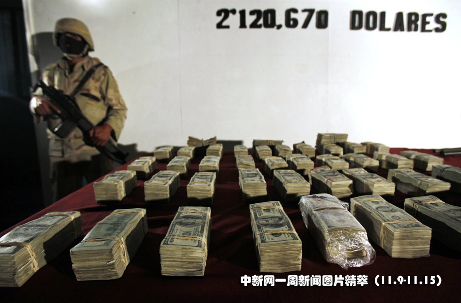 12日(周四),墨西哥軍方展示繳獲的贓款。圖片來源:中國(guó)新聞網(wǎng)