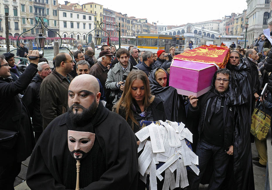 意大利北部歷史名城威尼斯人口跌至6萬以下,當(dāng)?shù)厥S嗟木用?4日替自己的城市安排了一場(chǎng)“葬禮”,希望喚起世人對(duì)該市當(dāng)前困境的重視。圖片來源:中國新聞網(wǎng)