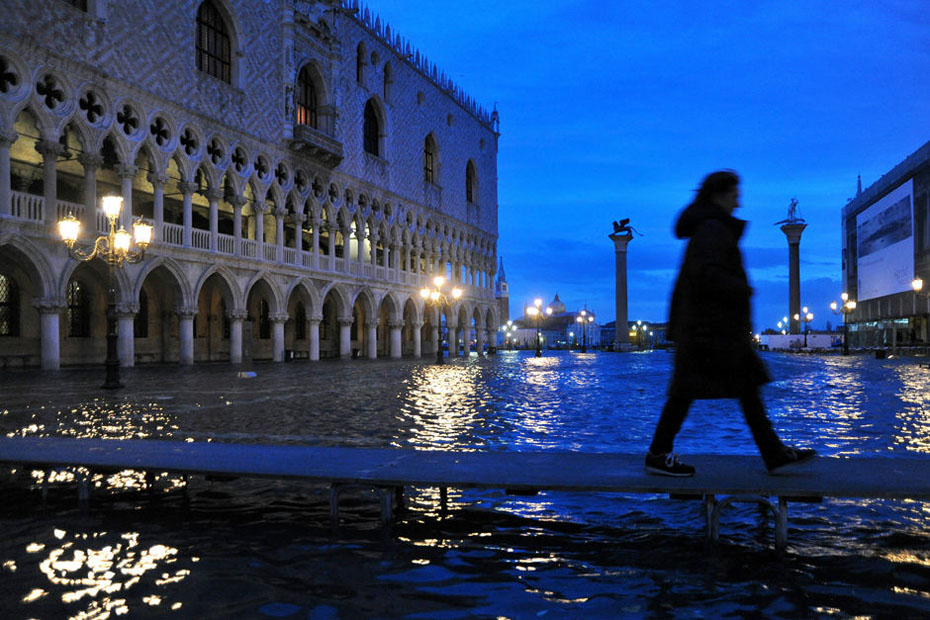 圖為行人走在在圣馬可廣場上臨時搭建的走道上。