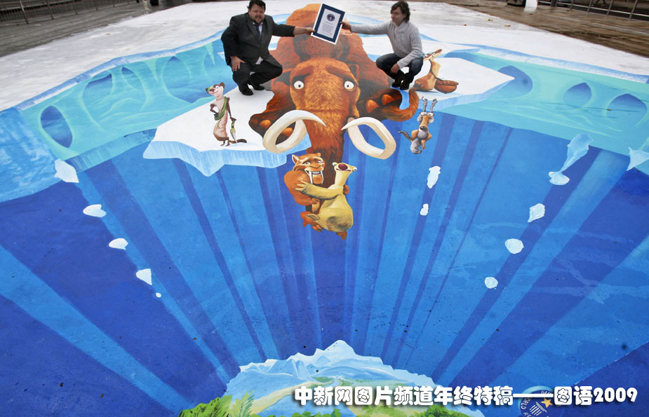 世界最大的3D立體畫:11月23日,德國街頭畫家埃德加·穆勒在英國倫敦一家購物中心展示他以動畫電影《冰河時代3》為主題創(chuàng)作的大型立體畫。這幅立體畫占地320平方米,創(chuàng)造了新的吉尼斯世界紀(jì)錄,給人們帶來妙趣橫生的視覺體驗。圖片來源:中國新聞網(wǎng)
