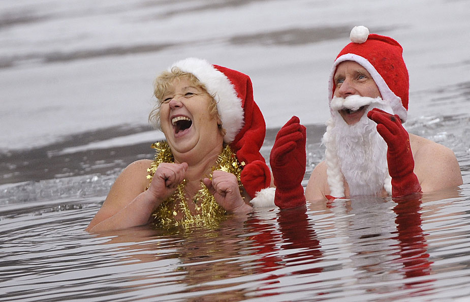 12月25日,德國柏林的冬泳俱樂部“柏林海豹”(Berliner Seehunde)的成員不畏寒冬,光著身子在已經結冰的Oranke湖中暢游一番。圖片來源:中國新聞網