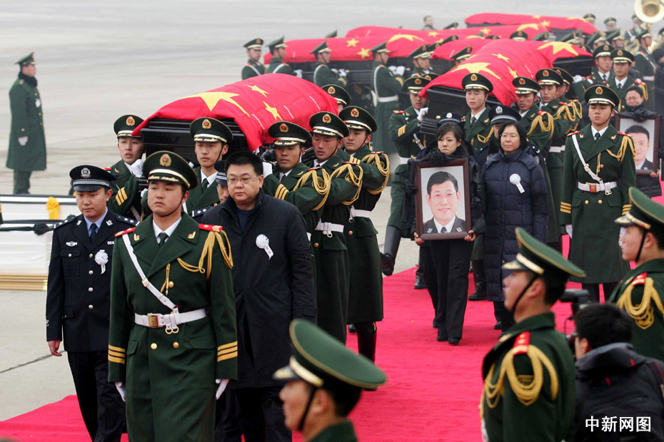 1月19日上午,在海地地震中犧牲的八位中國維和警察遺體回國接機(jī)儀式在北京首都機(jī)場(chǎng)舉行。中新社記者 富田 攝