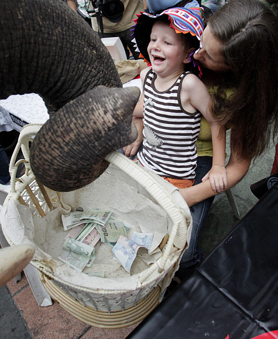 1月21日,在泰國首都曼谷舉辦了一場大象為海地災(zāi)區(qū)募捐活動。人們紛紛向大象攜帶的籃子內(nèi)放入善款,向海地地震幸存者獻(xiàn)上一份愛心。圖片來源:中國新聞網(wǎng)
