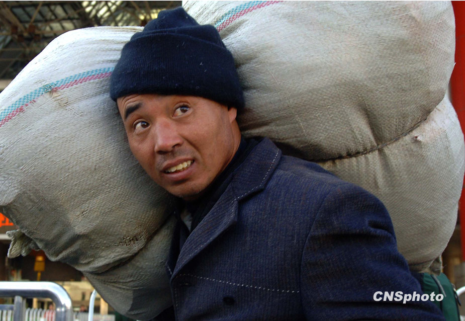 一年一度的春運(yùn)今日起正式開始。2010年的春運(yùn)從1月30日起至3月10日,為期40天,其中節(jié)前15天,節(jié)后25天。據(jù)權(quán)威預(yù)測,今年春運(yùn)客運(yùn)量料超25億人次。 1月30日,北京西站廣場上,一名中國民工扛著行囊和打工的收獲,返鄉(xiāng)過節(jié)。中新社發(fā) 鄒憲 攝